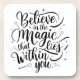 Porta copos inspiracional com a frase "Acredite na magia que está dentro de você".
