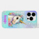 Esta capa de telefone mágica apresenta um adorável Unicórnio com um macaco aqua contra fundo de brilho. Projetado em púrpuras, lavandas e pinks com brilho e personalizado com seu nome. Faz um presente excelente para garotas de todas as idades!