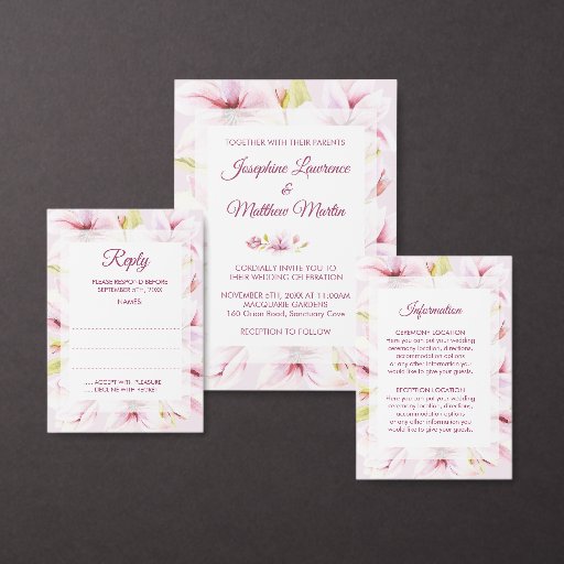 Estes convites de casamento em aquarela apresentam lindas flores e botões de magnólia. Você pode alterar as cores e os tamanhos do texto clicando no botão "Personalizar". Estes convites para casamento fazem parte de uma coleção que inclui uma gama de cheios de papelaria de casamento igual, como cartões de resposta, cartões de informação, etiquetas de endereços, autocolantes, programas e muito mais.