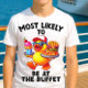 Esta engraçada design de pato de cruzeiro "Muito Provável de Estar no Buffet" é perfeita para camisas de cruzeiro! Excelente para viagens de família/amigos e cruzeiros de grupo!