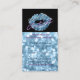 Cartão de visita do artista maquiador com beijo de batom azul glamouroso com faixas de zebra e faíscas brancas sobre o elegante fundo preto e azul claro do bico. Esta na moda é perfeita para os esteticistas, cosmetólogos, cabelos e maquilhagem donos de salões de beleza e outros na indústria da beleza. Se precisar de ajuda com este design, sinta-se à vontade para me contactar.