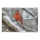 Um Cardeal vermelho brilhante adiciona uma pop de cor num dia de neve sonhador.