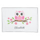Uma almofada bonita e personalizada para raparigas com uma coruja rosa sentada num ramo com folhas verdes e flores rosa. Nome personalizável ou outro texto curto.