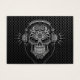 Um elaborado design do crânio de açúcar DJ, decorado com intrincados espirais e padrões de pontos. Fones de ouvido sentados em cima do crânio com dois fios pendurados abaixo. As linhas e círculos complexos são pretos sólidos enquanto o interior do crânio é acabado com texturas de aço inoxidável e cores prateadas. O crânio está sobre uma malha de aço que completa esse padrão industrial. Este dia agressivo da imagem inspirada nos mortos é uma representação colorida da cultura DJ.