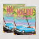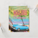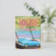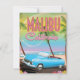 Viagens vintage de poster de um carro clássico antigo na Califórnia em Malibu, por uma bela praia.