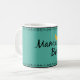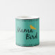 Fundo de turquesa com as palavras "Mama Pássaro" na rotulação preta e um pássaro do ouro que senta-se na rotulação. Um design preto está nas bordas superiores e inferiores.