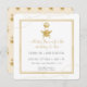 "Tipografia Elegante Script, Mamãe para Abelha, com Dourada Glitter, Convite para Chás de fraldas Neutro de Gênero Amarelo." Abelhas simples com coroa em brilho dourado com borda amarela quente e cintilação dourada. Um padrão de abelhas e coroa amarela preenche o reverso. Arte de uma artista e designer internacionalmente licenciada, Audrey Jeanne Roberts, copyright.