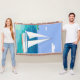 Blanket Tropical Costeira de Monograma. Um veleiro com seu nome, se aproximando de uma praia. Vista do mar tropical. Azul, lacrimejo, espuma marinha, turquesa, verde, branco.