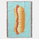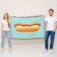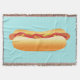 Este cobertor apresenta uma deliciosa ilustração de desenho animado de um lanche de cachorro quente. O cachorro quente tem um pão apetitoso e há tanto ketchup quanto mostarda em cima da linguiça.