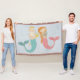 A mão branca desenhou feições gráficas de uma sereia moderna com cauda rosa, seu gato de estimação e Netuno, Rei do Mar