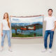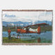 Um piloto de arbusto fica perto do seu flutuador de Havilland Canada DHC-2 Beaver na costa de um lago no extremo norte; montanhas e árvores estão à distância. O texto personalizável lendo "Alaska" também é exibido. Esta imagem foi derivada, em parte, de uma foto do Serviço de Pesca e Vida Selvagem dos EUA.