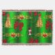 Um design de Natal bonito com um padrão de decorações de Natal incluindo árvores de Natal douradas, groselhas de ouro e morangos vermelhos, arcos de seda vermelha e um adorável boneco de veludo vermelho e colete, tudo em um fundo verde para adicionar algumas alegrias de Natal à sua casa durante as férias.