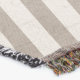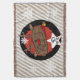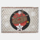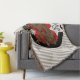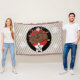 Um belo cobertor de natal apresenta uma rena vermelha e gira no fundo de uma cinza com faixas brancas na diagonal, uma faixa de preto sólido com alguns flocos de neve brancos e um centro vermelho com bolinhas brancas.