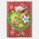 Papais noeis e Reindeer de Natal jogam cobertor, colorido, divertido, fofo e alegre! Apresenta Santa Clause vestido com seu terno vermelho e boné com um saco de brinquedos pendurados nas costas, uma árvore de Natal com bolas vermelhas, renas marrom bonitinhas, flocos de neve e bolinhas brancas sobre um fundo de vermelho, verde e amarelo. Há também uma faixa de forma estelar que você pode personalizar com o seu monograma inicial!
