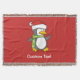 Um pequeno desenho animado de pinguim com chapéu de santa e cachecol verde andando na neve.