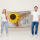 Personalize o encantador Jremor de Casamento Sunflower e Lace Country com os nomes da noiva e noiva e data de cerimônia de casamento para criar um noivado pessoal, chá de panela ou guardar presente de casamento. Este cobertor de casamentos do estilo rancho, relaxado e rústico, apresenta uma fotografia floral acinzentada de uma flor de girassol amarela, de um lenço de linho desbastado e de um véu de brasa branco, com um fundo de madeira castanho e curvada.