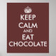 Faça posters tranquilos personalizados com este modelo. Tem o logotipo calmo da coroa, em branco, e as palavras em branco. Diz "Calma" e "Coma Chocolate". Você pode alterar o estilo ou a cor da fonte para personalizar. Ou alterar a cor de fundo. Neste momento está numa cor castanho de cacau. Este é presente de excelente para qualquer amante de chocolate ou chocolate, ou para uma padaria, uma loja de doces ou um compro de café. Mantenha modelos calmas para posters, camisas e canecas em Mantenha Calma e Seu.