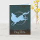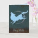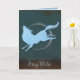 Uma ilustração espantosa de um lobo branco voando através da lua num cenário de floresta escura. O texto do cartão de saudação lê "Permanecer no Mundo" em uma fonte de script.