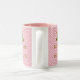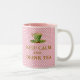 Esta caneca foi feita para direita ou esquerda com as mesmas imagens e citações de ambos os lados. "Mantenha a calma e beba chá" em tom dourado com uma equipe vitoriana verde coberta por rosa, em fundo de bolinhas rosa e branco.