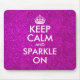 Mantenha-se calmo e brilhe no mouse pad cor-de-rosa. Mantenha A Calma Personalizada E O Suporte De Rato Do Seu Computador De Texto. Modelo personalizável. Faça o seu próprio engraçado, fique calmo e carregar na paródia do museu. Textura púrpura falsa com brilhos brilhantes e faíscas brilhantes. Vintage mantém o slogan da tipografia calma. Uma ideia glamourosa de presente para mulheres e raparigas.