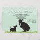 Uma silhueta deliciosa de uma menina dizendo a seu cachorro para "manter o segredo". A imagem é jogada contra um ponto de capim com flores. Acima deles cascata uma cobertura de flores em branco. O fundo é verde-claro. Um convite excelente para uma festa surpresa para qualquer idade.