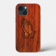 Linda textura cristã de madeira de mogno com mãos rezando capa de telefone.