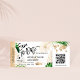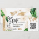 Bilhete de embarque de casamento na praia de destino Avião dourado Salvar a data com ícone de navio de cruzeiro com folhas tropicais. Adicione seu código QR