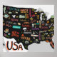 Mapa ilustrado dos EUA. Poster com estados e atrações da América. Explore as visões dos EUA com um mapa ilustrado. Descubra os EUA com um mapa ilustrado mostrando seus estados e atrações. mapa, eua, hollywood, ilustração, américa, estado, turista, decor, viagem, natureza, árvore, paisagem, desenho animado, preto, fazenda, tipografia, montanhas, estilo de vida, árvores, saco