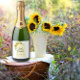 Um rótulo de vinho espumante elegante apresenta um arco graciosamente curvado composto por girassóis vibrantes e delicadas margaridas brancas. As matizes amarelas ensolaradas das flores de girassol criam uma sensação quente e convidativa, complementando maravilhosamente o branco pristine das margaridas. Juntos, os girassóis e margaridas formam um arco atraente visualmente, acrescentando um toque de elegância natural à design geral do rótulo do vinho espumante. O arco das flores melhora a estética do rótulo, transmitindo uma sensação de sofisticação e brilho alegre.