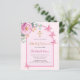 Um fundo cor-de-rosa com um arco. Decorados com um verde-floral, rosa, de cor verde, verde-aquoso de eucalipto e borboletas. Personalize e adicione um nome e detalhes. Traseira: cor de fundo cor-de-rosa pincelada. 1 folha = 1 convite impresso de borda a borda.