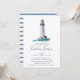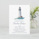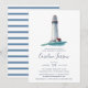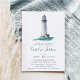 Os convites para bebês costeiros Elegantes para marinheiros no caminho apresentam uma ilustração aquosa de um farol em marinho, vermelho e branco em um mar lacrimogêneo, tocando os detalhes do seu chá de fraldas em caracteres azuis-marinho náutica.