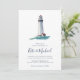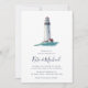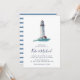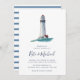 Os convites de casamento costeiro elegantes apresentam uma ilustração aquática de um farol em marinho, vermelho e branco em um mar lacrimogêneo, tocando seus detalhes de casamento em uma letra azul marinho náutica chic.