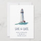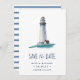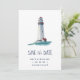 Os cartões salve a data costeiros elegantes apresentam uma ilustração aquarela de um farol em marinho, vermelho e branco em um mar lacrimogêneo, no topo "salve a data" e nos detalhes de seu casamento em letras náuticas azuis de marinho.