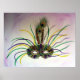 Pintura aquosa com ligeiros toques pastéis de uma máscara Mardi Gras de pena. O usa as tradicionais cores Mardi Gras de roxo, verde e ouro. Duas penas de pavão em cima da máscara.