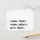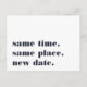 Precisa adiar ou remarcar o seu casamento? Deixe os convidados saberem com esses cartões-postais modernos e alegres em branco com letras em azul-marinho rico. O design baseado em tipografia engraçada e inteligente apresenta "mesmo horário, mesmo local, nova data" na frente, com a nova data do casamento e detalhes no verso.