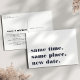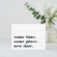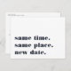 Precisa adiar ou remarcar o seu casamento? Informe os convidados com esses cartões-postais modernos e alegres em branco com letras em azul-marinho. O design engraçado e inteligente baseado em tipografia apresenta "mesmo horário, mesmo local, nova data" na frente, com a nova data do casamento e detalhes no verso.