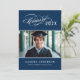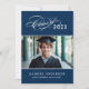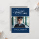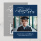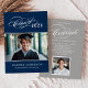 Celebre seu graduado com este elegante convite de festa de graduação que apresenta um script de caligrafia "Classe de" com o ano em um rico fundo azul-marinho ao lado de um retrato de formatura emoldurado por finos acentos de linha. O verso cinza apresenta um belo título de "Celebre" com um segundo espaço para foto e todos os detalhes da sua festa. Texto totalmente personalizável em ambos os lados.