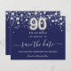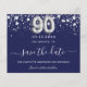 Uma cinta e uma moda Salve a placa Date para uma festa de aniversário 90. Um fundo azul marinho colorido. Decorado com estrelas de falso prata. O texto: Salvar a Data é gravado com um script de estilo com letra de tendência grande. O número 90 é gravado com uma fonte no estilo do balão.
