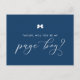 Bonito cartão de proposta do garoto da página temática parisiense. Peça à família e aos amigos que façam parte do seu casamento com este cartão personalizado "Você vai ser meu garoto de página". Ele apresenta um arco e um script elegante. em um fundo azul marinho Personalize adicionando um nome e uma mensagem