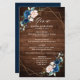 Menu de casamento geométrico azul-escuro marinho com elegante buquê de azul-marinho, azul-real, branco, rosa e folhas verdes de eucalipto sage e elegante quadro geométrico neutro de brilho no fundo da madeira rústica. Entre em contato comigo para obter ajuda sobre a personalização ou se você precisar de outro produto com este design.