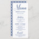 Menu de casamento minimalista em branco com texto de caligrafia azul marinho e fontes elegantes. Personalize com seus nomes e data do casamento. A parte traseira apresenta um padrão típico em cores correspondentes.