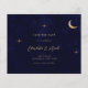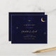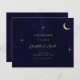 Um convite de casamento celestial moderno minimalista apresenta uma design simples e elegante. Inclui uma lua de folha de ouro e estrelas que brilham suavemente, colocadas sobre um fundo azul-da-noite. O convite usa a tipografia serif clássica, que adiciona um toque tradicional e formal com seu estilo limpo e limpo.