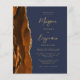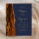 A borda esquerda deste elegante convite de casamento moderno apresenta uma cor de água laranja queimada, aparada com falsa brilho dourado. O texto personalizável combina o script dourado e as fontes sans serif em um fundo azul marinho escuro. O verso apresenta uma design de cor laranja queimada e dourada.