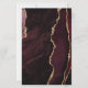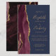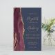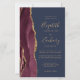 A borda esquerda deste elegante convite de casamento moderno apresenta uma cor vermelha e borrifada, com uma falsa brilha de ouro. O texto personalizável combina manuscrito dourado, fontes em copperplate e itálico em um fundo azul marinho. O design de agata burgundy é repetido na parte de trás do cartão.