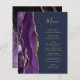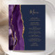 A borda esquerda deste elegante cardápio moderno de casamento apresenta uma cor d'água roxa, borda agitada com falso brilho dourado. O texto personalizável combina um script de escrita manual dourado e fontes de impressão em um fundo azul marinho. O verso apresenta um design de agate roxo e dourado correspondente.
