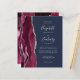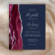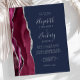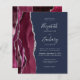 A borda esquerda deste elegante convite de casamento moderno apresenta uma cor d'água borrifada com borda cortada com cintilação falsa de prata. O texto personalizável combina a escrita manual de cinzas prateadas, fontes copperplate e itálico em um fundo azul marinho. O lado inverso apresenta um design de burgundy e agate prateado.