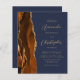 A borda esquerda deste elegante convite de casamento moderno apresenta uma laranja queimada e uma aquarela ferrugem borda agitada com falsa brilho de ouro. O texto personalizável combina o script dourado e as fontes sans serif em um fundo azul marinho. O verso fornece espaço para detalhes do casamento em um fundo azul de marinho sólido, junto com um código QR que os convidados podem digitalizar para visitar seu site e RSVP, o que economiza o custo de imprimir e enviar cartões RSVP separados.