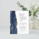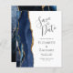 A borda esquerda deste elegante casamento moderno salve o cartão de data apresenta uma marinho azul de aquarela agata borda aparada com falso brilho dourado. O texto personalizável combina a escrita manual de cinzas de carvão, as fontes em copperplate e itálico em um fundo branco. O verso apresenta um design azul-marinho e um agate-ouro correspondentes.