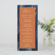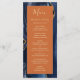 Este elegante e moderno menu de casamento mostra um marinho azul de aquarela com o fundo de agata aparado com brilho dourado. O texto aparece em letras elegantes douradas e fontes em placas em um retângulo laranja queimado. O design de ágata é repetido no reverso.
