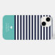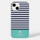 capa de telefone personalizada na moda em aqua, azul marinho e branco. Este design apresenta um marinho clássico pré-disquete e um padrão listrado branco. Personalize-o com seu nome monograma ou outro texto personalizado com um símbolo cardíaco fofo. Use as ferramentas de design para escolher qualquer cor de fundo, editar as fontes e cores do texto e carregar suas próprias fotos para criar uma única de um tipo de cobrir de dispositivo!